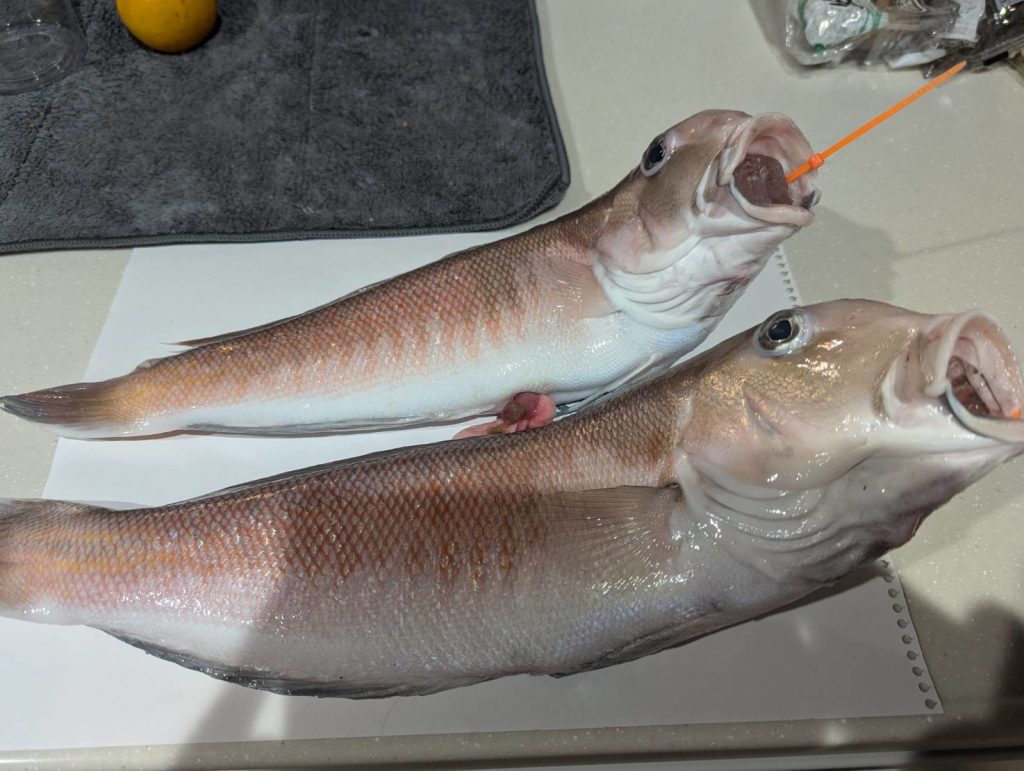 そしてこの日も新しい試みとして、キャスラバタックルを導入!とりあえずのフラッグシップのビンビンRBのロッドを購入し、手持ちのエメラルダスをセットして挑戦。ここでやる釣りは流さずにアンカー打って固定されるので、バーチカルだと厳しい印象だったので、キャスラバが正解になると踏んでいました!そして読み通りこの短い時間でヒット⋯もバラす💦しかも船長に話しかけられ、会話しながらやりとりして😭気を取り直して同じポイントに入れてみると、同じようにアタリが出たので慎重に対応⋯!塩焼きに良さげな小ぶりサイズをいただきました!