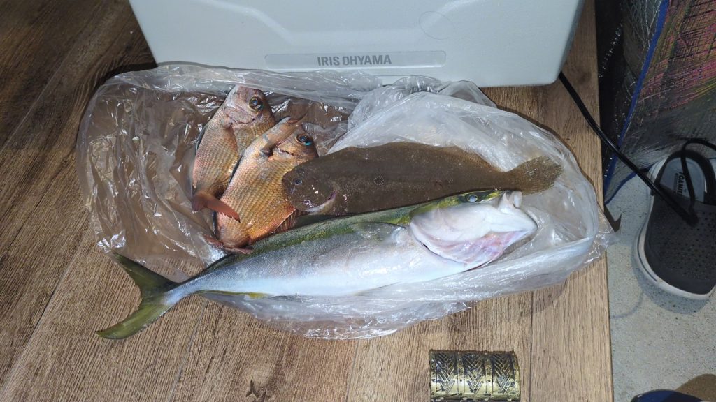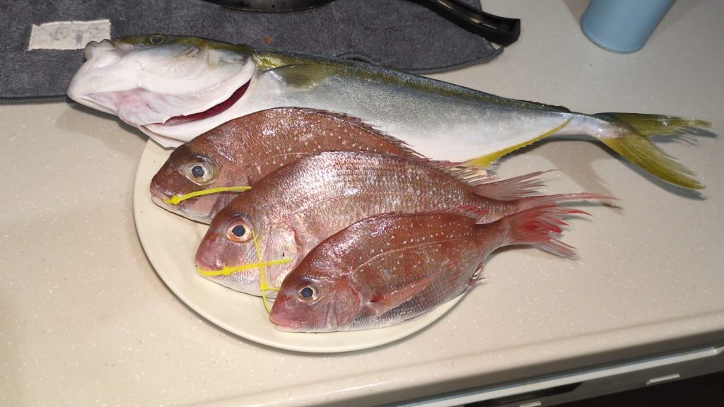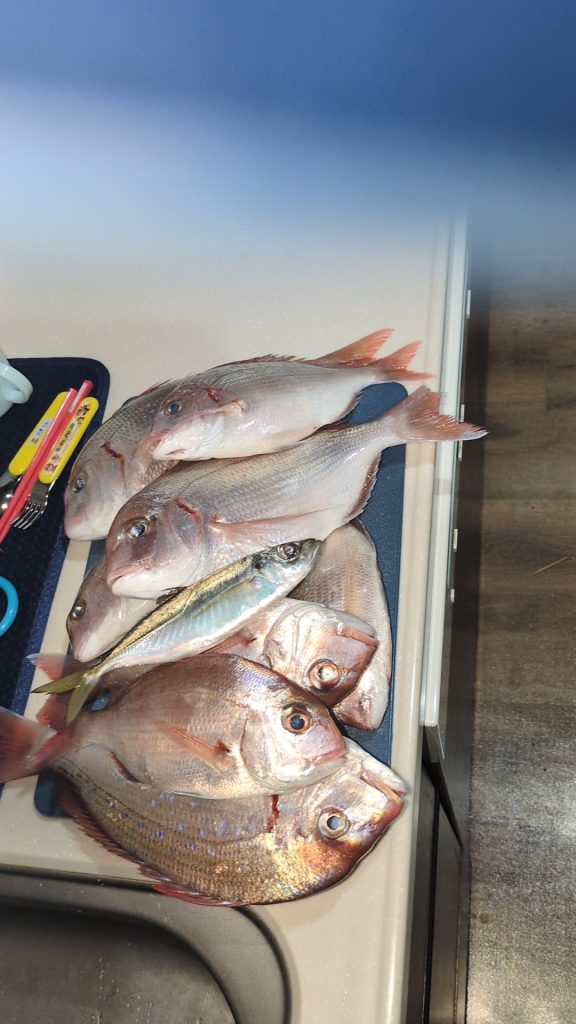 その後も順調に真鯛をあげて、ゲストの鯵も参戦して満足のいく釣果に!心残りはS氏に負けたこととO氏が真鯛1匹で終わってしまったことでしょうか⋯ともあれ、人生初タイラバで真鯛!お家で美味しく頂きました♪