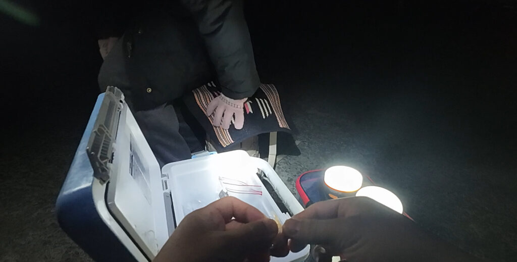 全体的に周囲も反応ありませんし、なにより寒い・・・!そしてはじめてドラム缶上で釣りしたんですが、陣取った位置が一番湾内側。ここ、常夜灯もないんですね…。トイレ・自動販売機側は常夜灯の恩恵もありそうでしたが、とても魚がいそうな気配がないので早々にギブアップ…。実釣30分もないくらいの納竿となりました。