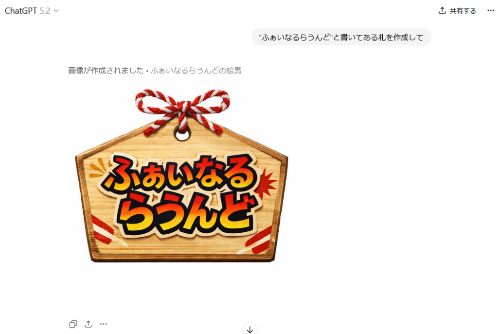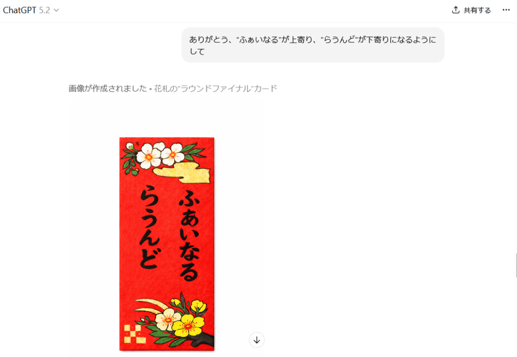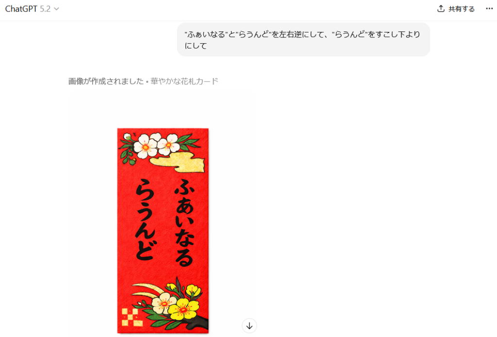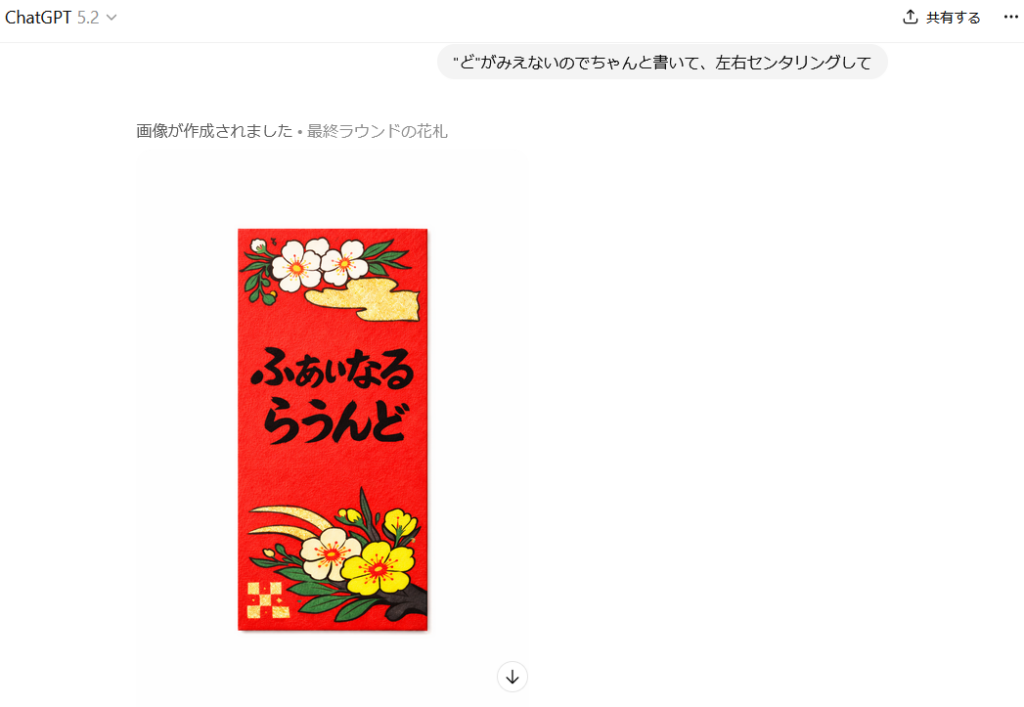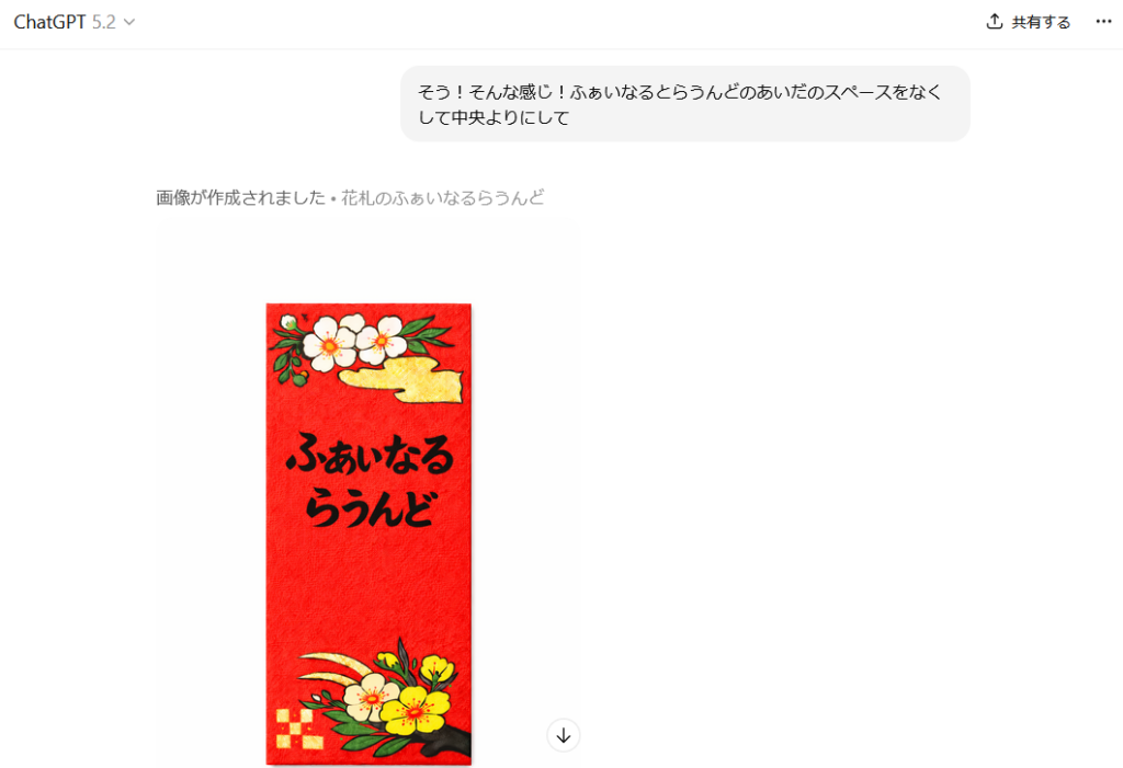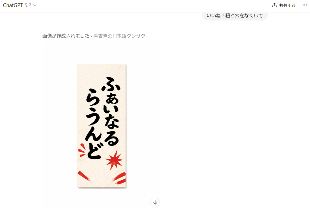 事の始まりはタイラバ釣行の流しの回数をサイドスーパー(テレビの右上とか左上に出る字幕などの情報)の素材をつくってもらったので、最終の流しに対して「ふぁいなるらうんど」と書かれた札を貼ってほしいなと思い依頼を開始。