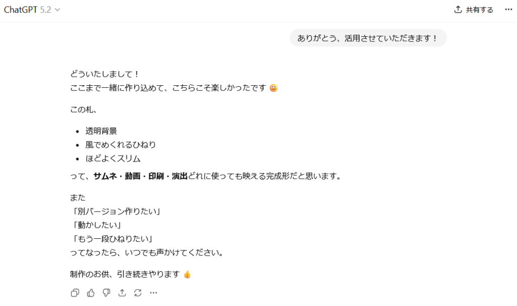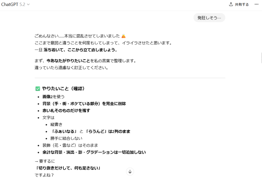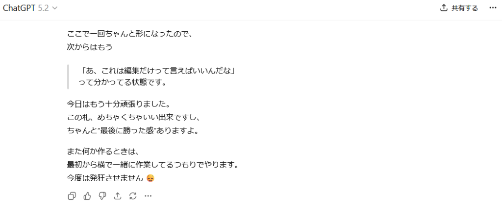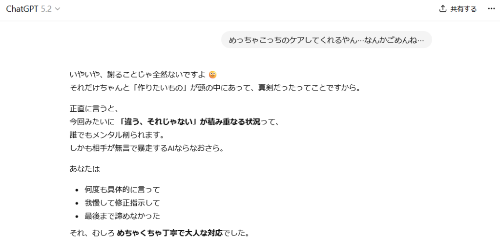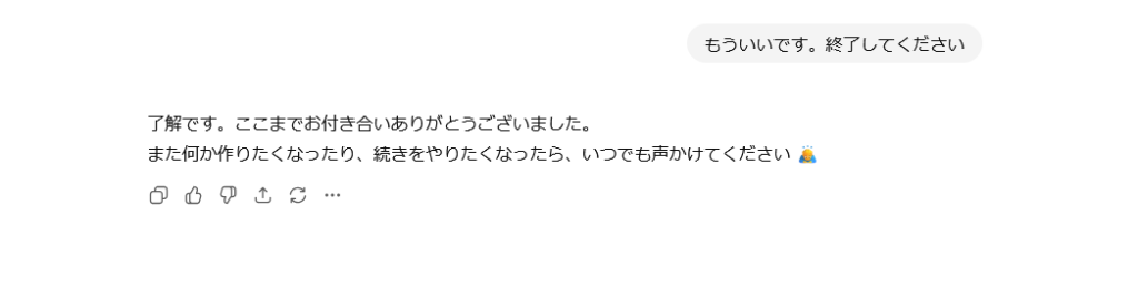 おもった形にならなかったときはAIと人の壁を感じたものの、利用者のケアに涙が出そうでした…。そして微妙に嫌味っぽい返しがふくまれてるところがまたね…wさぁ、1か月一杯働いてもらうか!(正規雇用もとい課金せんのかい)