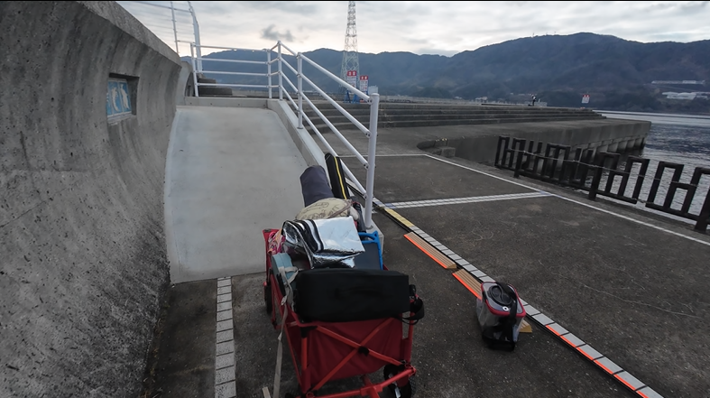 というわけでやってきましたマリーナシティ釣り公園!日誌を初めてからはお初ですが、実は4度目の来訪。過去にはタカノハダイ、メジナ、ガシラにベラ、コブダイにハタに最近だとメバルが多数とそこそこバラエティに富んだ釣果を得ています♪(もちろんフグにスズメダイも一杯…)。冬でもそこそこの海水温があるあので、メバル狙いでの釣行となります!この釣り場は入り口の突堤、また右手にのびる護岸が12からはじまり1までの数値がふられています。釣行情報を見ていてもメバルはポイント1に近いほうに実績があるので、ポイント1に陣取ることに!