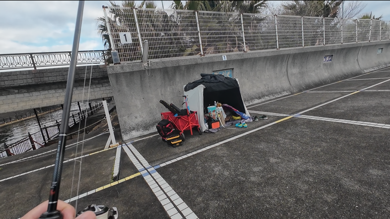トイレなんかは入り口にあるので、そこから一番遠いというデメリットも有。子供用のテントを設営し、竿を組んでひとまずアジングタックルで様子見。デイでさっくりメバルちゃんでたりせんかねぇ~♪なんて勇んでいると・・・エアレーションの入った道具一式忘れていることが発覚。我が家は釣った魚をキープし、なんちゃってアクアリウムとして撮影するので必要なのですが、やってしまった…。ダイソーバッカンが網状のスカリになっているので、それでどうにかすることに。