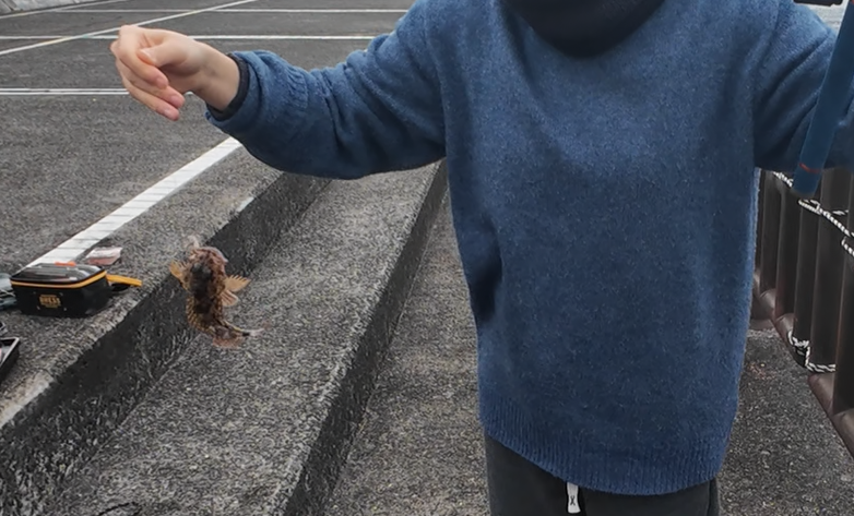 いやー、小物のベラとはいえ釣れるとやはりうれしいですね!とりあえず1匹あげれたので、どうにかメバルを釣りたいのでまた虫ジグ単にもどしてネチネチすることに。嫁さんも胴付き→サビキに持ち換えて続行していると、ここでも定番魚がヒット!