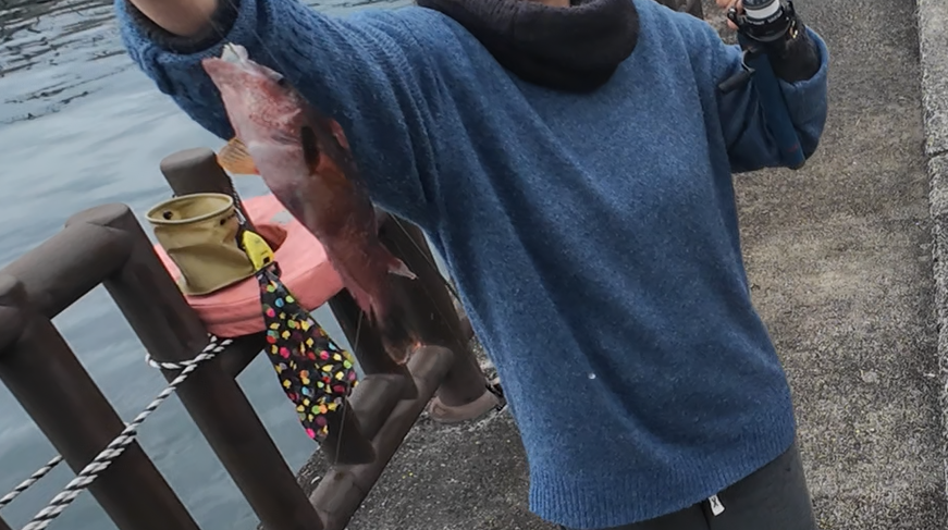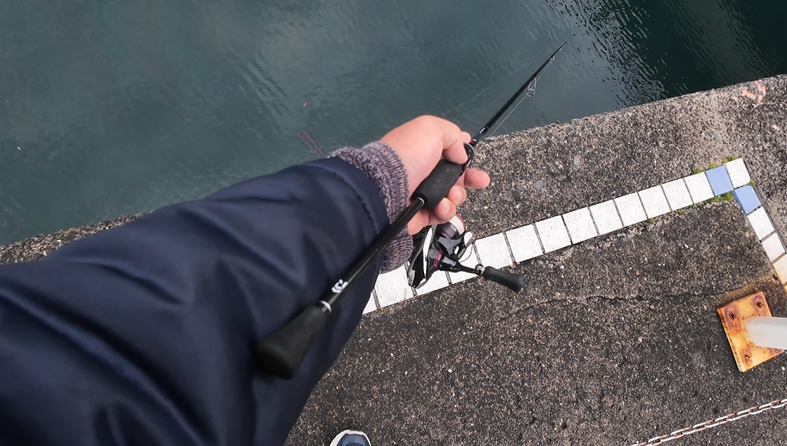 結局釣れないまま1時間半が経過しようというところ…。お子らのお手洗いに嫁さんがつきそってる隙に穂先が折れて補修したレテショーティ(通称:折れショーティー)を拝借して胴付きを投入。根掛かりを食らい糸を切る羽目になりつつ、仕掛けを作り直して再投入・・・すると