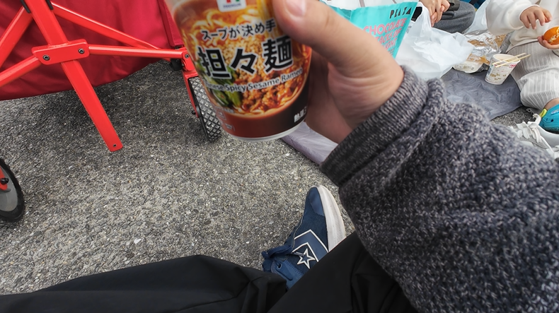 小腹が空いたのでひとまずごはんを食べることに。冬に屋外に食べるカップラーメン、しみわたりますねぇ…
